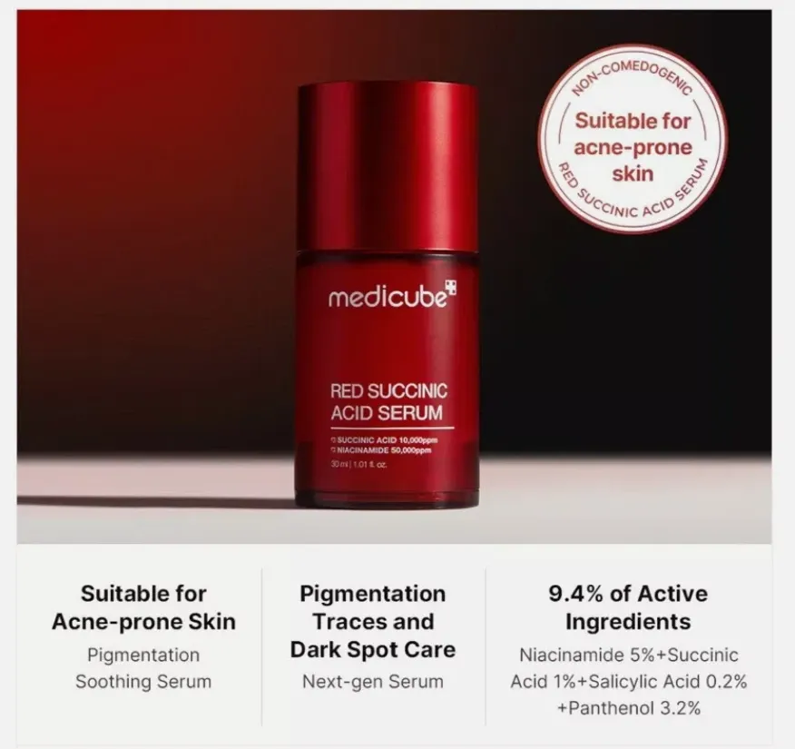 **وصف كامل**: سيرم Medicube Succinic Acid هو منتج مبتكر مصمم لتحسين صحة البشرة ومظهرها. يحتوي على مكونات فعالة تساعد في تقليل حب الشباب والعيوب، مما يجعله الخيار المثالي لمن يعانون من مشاكل البشرة.