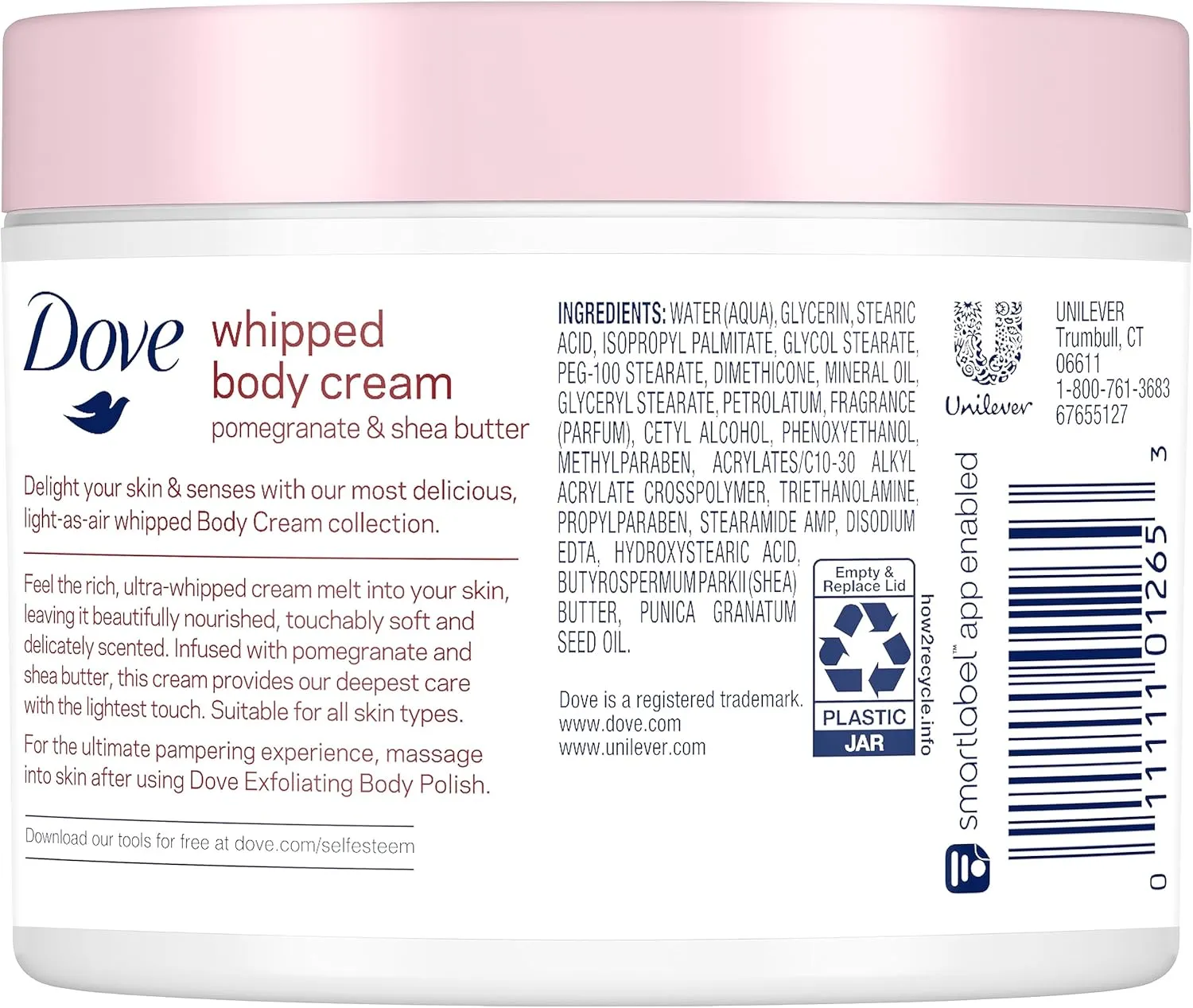 While the full ingredient list is available on the product packaging, Dove Whipped Body Cream is crafted with a blend of nourishing ingredients designed for optimal skin health. It typically includes:
